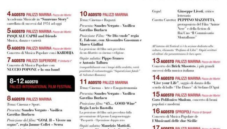 Da questa sera e fino a giorno 12, Piazza dei Martiri di Palizzi Marina ospiterà la quarta edizione del Palizzi International Film Festival; la kermesse cinematografica organizzata dall’associazione culturale “La Fenice” di Stefano Baldrini, sostenuta dal sindaco di Palizzi, Walter Scerbo ed in collaborazione del Parco Nazionale d’Aspromonte e la direzione artistica di Giacomo Battaglia, di cui farà le veci la sorella Angela.