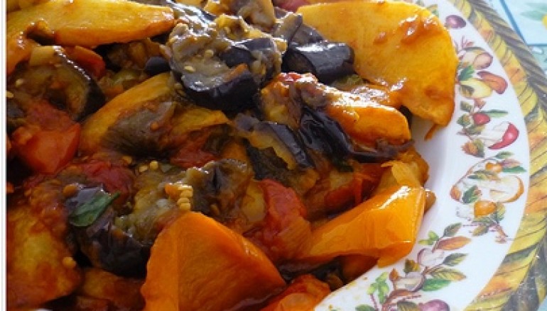 di Francesca Tripodi Lavate i peperoni e i pomodori, asciugateli e fate una leggera incisione a croce sulla buccia. Portate a bollore una pentola colma d’acqua , immergete i pomodori e i peperoni e fateli scottare per 5 minuti. Scolateli con una schiumarola, sbucciateli ed eliminate i semini. Lavate accuratamente, pelate e tagliate a tocchetti le patate, le melanzane, il sedano; affettate sottilmente la cipolla, snocciolate e riducete a pezzetti le olive. Fate rosolare la cipolla nell’olio caldo; a questo punto unite le verdure tagliate, mescolandovi anche le olive. Salate e cuocete a fiamma moderata per 20-30 minuti mescolando di tanto in tanto e aggiungendo dell’acqua se necessario. Quando le verdure saranno tenere, spegnete il fuoco e servite.
