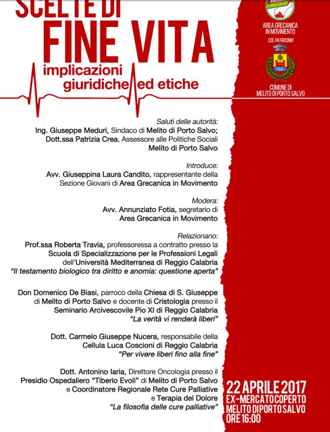 Il Movimento Area Grecanica in Movimento, in collaborazione con il Comune di Melito di Porto Salvo, organizza per sabato 22 Aprile 2017, alle ore 16:00, presso la sala Convegni dell’ex Mercato Coperto di Melito Di Porto Salvo un convegno dal titolo “Scelte di fine vita: implicazioni giuridiche ed etiche”.