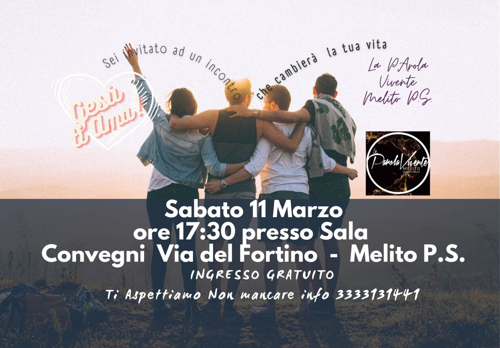 Un incontro affinché giovani e meno giovani possano essere sensibilizzati di più alla ricerca e fiducia in Gesù. Riunione Evangelistica di fede e guarigioni a Melito Porto Salvo organizzata dall’associazione cristiana la Parola Vivente di Melito “non per inculcare una religione, ma affinché chiunque possa conoscere Gesù come personale Signore e Salvatore.