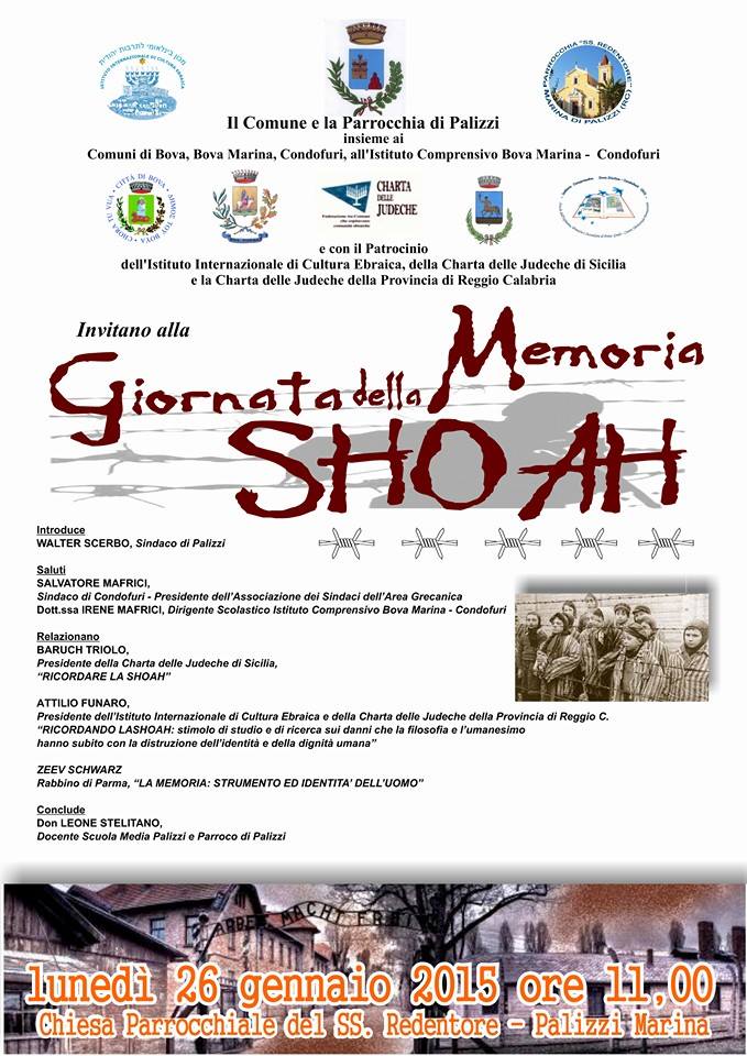 Il Comune e la Parrocchia di Palizzi insieme ai comuni di Bova, Bova Marina, l’Istituto Comprensivo di Bova Marina, Condofuri e con il patrocinio dell’ Istituto Internazionale di Cultura Ebraica, della Charta delle Judeche di Sicilia e la Charta delle Judeche della Provincia di Reggio Calabria, invitano lunedì 26 gennaio 2015 alle ore 11:00 a Palizzi Marina presso la Chiesa Parrocchiale del SS. Redentore alla Giornata della Memoria Shoah.