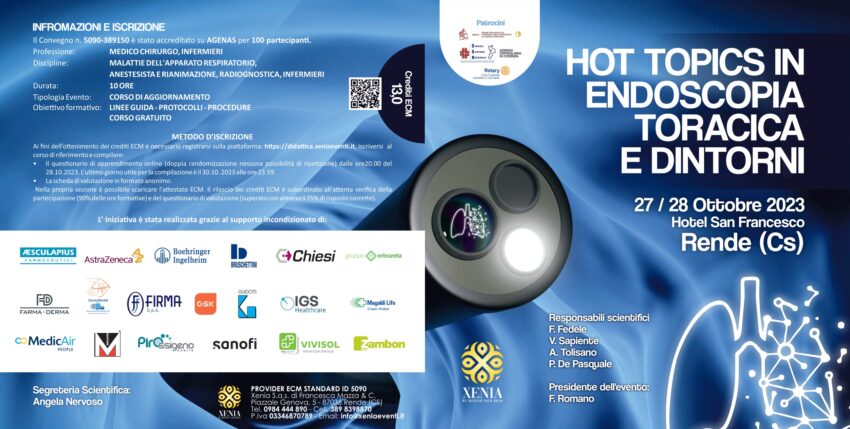 Gli argomenti più importanti riguardanti le malattie dell’apparato respiratorio e il ruolo determinante dell’endoscopia toracica, saranno oggetto del workshop che si svolgerà, dopodomani, venerdì 27 (dalle 15,00 alle 18,00) e sabato 28 (dalle 9,00 alle 13,00) ottobre prossimi, a Rende, hotel “San Francesco”, provider Ecm “Xenia Eventi”. Tre le sessioni in cui l’incontro scientifico si svilupperà: Endoscopia toracica e principali scenari nella pneumologia di oggi; interstiziopatie polmonari; patologie respiratorie croniche, insufficienza respiratoria.