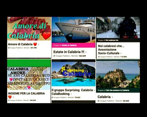 Come primo gruppo abbiamo “Amore di Calabria” che conta oltre 167.000 membri. Il gruppo spazia in vari settori, con un particolare punto di riguardo alle specialità culinarie della nostra Regione, all’arte, alla musica, ma anche serbando un rapporto socio-comunicativo, d’interfaccio e fratellanza, riuscendo pur sempre a conservare un ruolo di primo piano nel riporto della bellezza dei nostri luoghi.