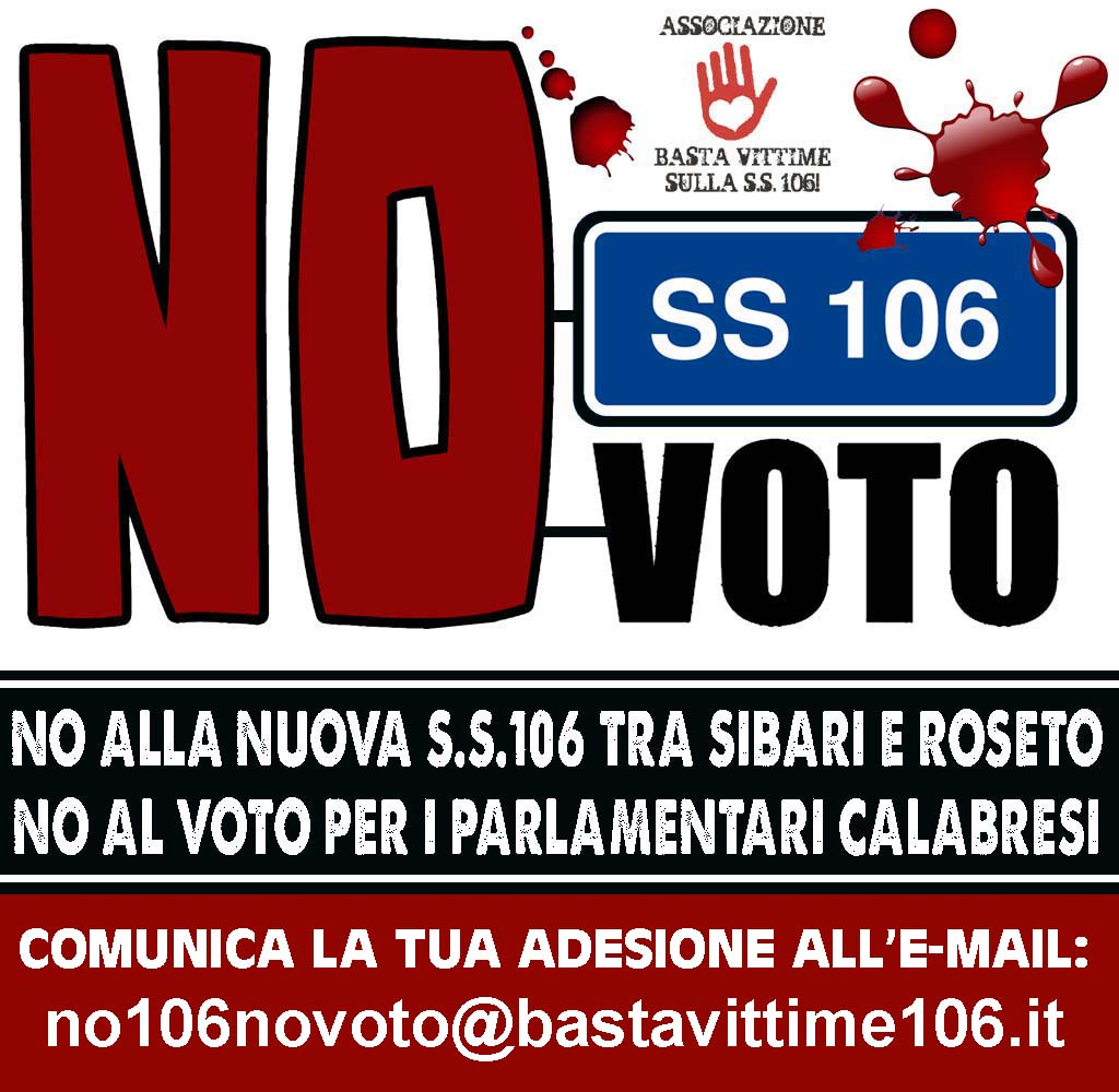 Voglio però far notare che di fronte ad un problema enorme qual è quello che riguarda la “strada della morte” i nostri rappresentanti alla Camera invece di pretendere con forza l’avvio immediato di un progetto che è già approvato, che ha già le coperture finanziarie e che costituirebbe un importante risultato per la sicurezza stradale e per lo sviluppo economico della nostra Calabria ci offendono – pensando che siamo degli stupidi – vantandosi l’approvazione d’inutili e ridicole mozione che nulla hanno a che vedere con i fatti concreti che sono altri!I fatti concreti sono semplici: c’è l’istruttoria di un progetto di 1,5 miliardi di euro già ultimata che aspetta una Delibera del Governo (CIPE), che ne avvii i lavori. C’è una regione piegata dal dolore per le continue perdite (soprattutto di giovani), a causa della strada più pericolosa d’Italia! C’è una Regione che vanta in Europa il primato della disoccupazione, dello spopolamento e della povertà e questi parlamentari invece di battersi come leoni per l’avvio istantaneo di un progetto che è fermo solo per volontà politiche perverse ed incomprensibili davanti ad una Associazione che lotta per l’interesse generale e suggerisce il non voto si coagulano e diventano “Casta” e provano a convincerci che loro, invece, hanno ottenuto un risultato.Cari parlamentari calabresi a Roma l’unico risultato che potete e dovete portare a casa è questo: l’avvio del 3° Megalotto della S.S.106 tra Sibari e Roseto! Perché non solo si parla di un’opera che riuscirà a salvare la vita di molte persone ed a evitare che altre restino per sempre segnate da danni fisici permanenti; non solo perché è necessario uscire dall’isolamento drammatico in cui è caduta questa Calabria; non solo per ragioni relativi, allo sviluppo, al progresso, al lavoro che in questa nostra regione mancano; non solo perché è fondamentale dare entusiasmo ad una comunità regionale depressa con la realizzazione della più grande infrastruttura prevista in Calabria per i prossimo 10 anni.