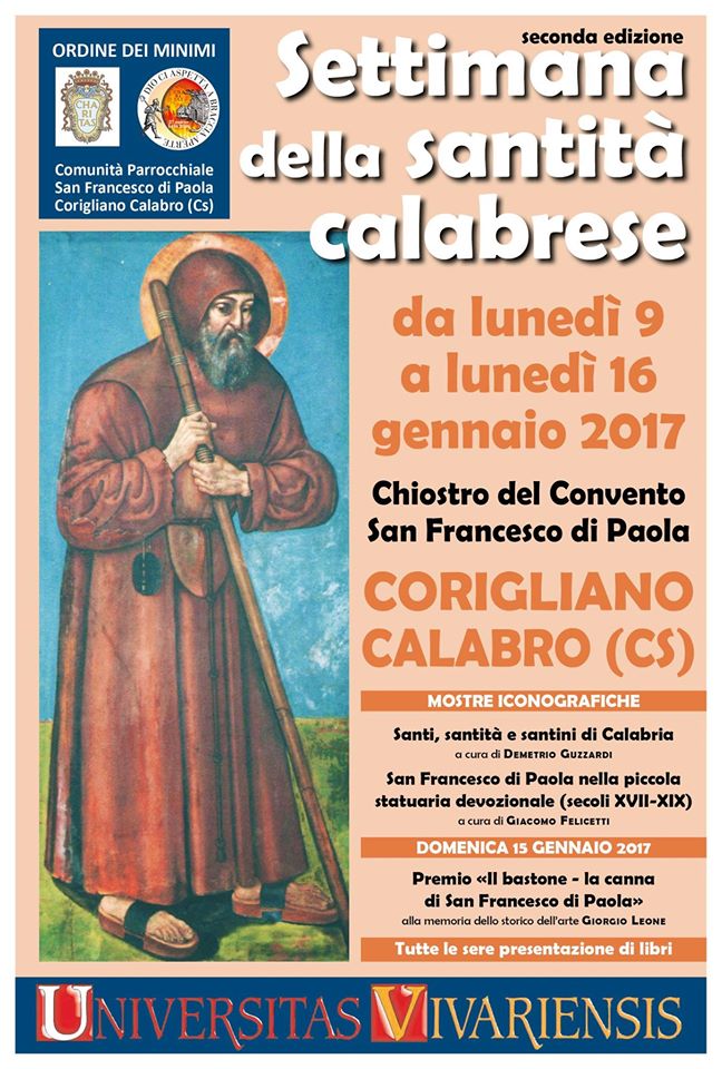 Dopo la prima edizione svolta nel maggio 2015 nel chiostro rinascimentale dei Minimi a Sant’Andrea delle Fratte a Roma, sarà Corigliano Calabro ad ospitare per 8 giorni la Settimana della santità calabrese. Mostre, incontri, docu-film, presentazioni di libri e la consegna del Premio «Il bastone-canna di San Francesco di Paola», riconoscimento agli studiosi del santo paolano.