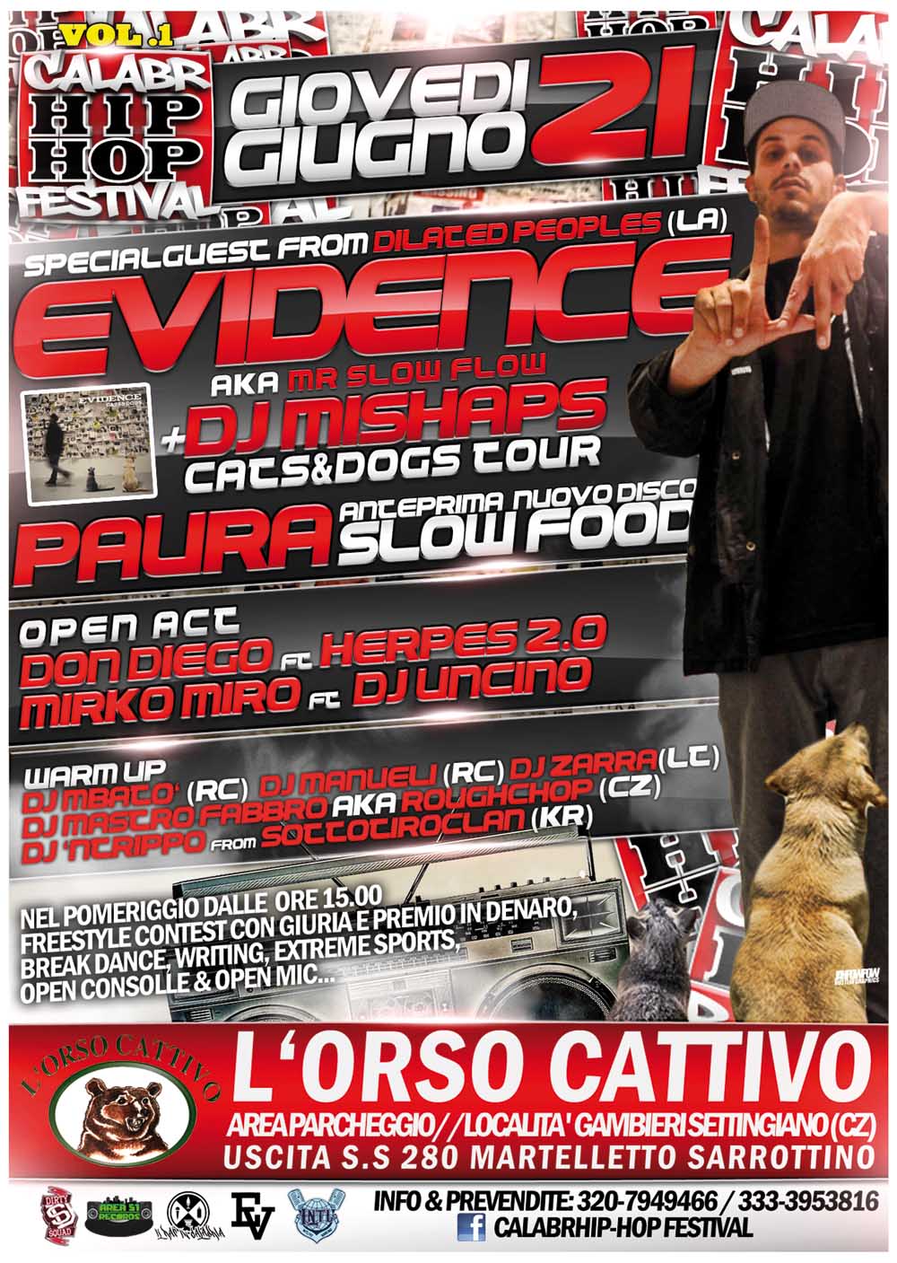 Il “CALABRHIP-HOP FESTIVAL” nasce dall’idea di riunire tutto il movimento Hip Hop calabrese in un unica giornata dedicata interamente alle 4 discipline. GIOVEDI 21 GIUGNO fin dal pomeriggio, nell’area parcheggio dell’Orso Cattivo, si svolgerà una vera e propria Jam, dove si esibiranno Breakers, Skaters, Writers, MCs e DJs calabresi. Per una questione logistica, chiunque volesse suonare, ballare, cantare o dipingere, è pregato di comunicarci la propria iscrizione ENTRO E NON OLTRE IL 18 GIUGNO telefonando ai numeri presenti nella pagina facebook dell’evento o semplicemente mandando un messaggio agli organizzatori.