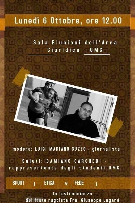 Fra Giuseppe sarà ospite dell’Università degli Studi “Magna Graecia” di Catanzaro, Lunedì 6 Ottobre e, dopo una breve visita delle strutture accademiche, accompagnato dal Presidente Emerito della Federazione Universitaria Cattolica Italiana (F.U.C.I.) del capoluogo di Regione – Sebastian Ciancio, prenderà parte all’incontro:”Sport, Etica e Fede” (Sala Riunioni dell’Area Giuridica – ore 12.00), moderato dal giornalista pubblicista – Luigi Mariano Guzzo e introdotto dal Coordinatore dell’Area Giuridica della Consulta Studenti UMG – Damiano Carchedi.