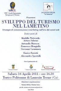 Sviluppo del turismo nel lametino e strategie di comunicazione e marketing nell’era del social web. Questo il titolo dell’incontro che si terrà il prossimo 16 aprile alle 16.30 presso il teatro Politeama di Lamezia Terme e che vuole offrire agli operatori turistici calabresi un momento di analisi e di riflessione sulla promozione turistica delle imprese e del territorio, tenendo conto delle dinamiche e delle tendenze del nuovo web.