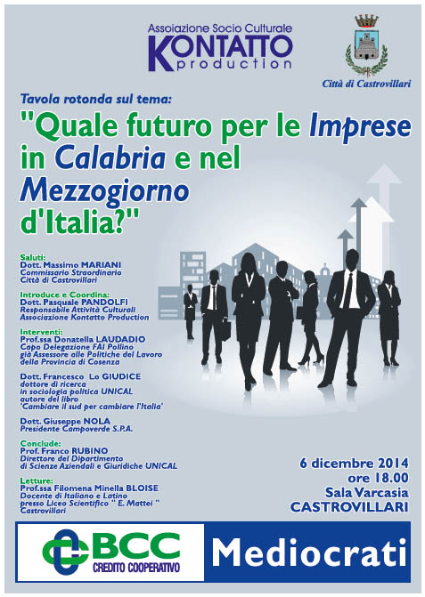 “Quale futuro per le imprese in Calabria e nel Mezzogiorno d’Italia?” è l’interessante titolo – domanda della tavola rotonda che si terrà a Castrovillari sabato 6 dicembre, a partire dalle ore 18, nella Sala Varcasia, alle spalle della chiesa di San Francesco, nei pressi di piazza Municipio, per mano dell’Associazione culturale Kontatto e con il patrocinio del Comune.