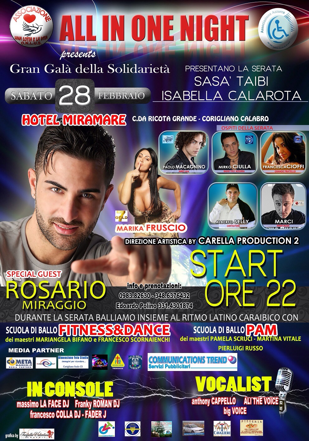 Papa’ Gabriele, che tra l’ altro e’ il Presidente Nazionale dellaonlus , non e’ nuovo a queste manifestazioni, anche se sono state sempre organizzate non in territorio Sibarita ma bensi’ in Calabria su Reggio e Vibo e fuori Regione in Lombardia, in Campania e piu’ volte in Sicilia. La Sicilia e Palermo nello specifico sono la Regione, il comune, di Mamma Maria. Ma tornando all’ evento del 28 febbraio, la direzione artistica affidata al manager coriglianese Ettore Carella, intimo della famiglia e molto vicino, sin dalla sua nascita, alla piccola Giulia. Ospite d’onore della manifestazione sara’ il noto cantante neomelodico Rosario Miraggio, il quale proprio in zona vanta una miriade di fans. Lo ricordiamo tutti la notte del 31 dicembre in diretta su canale cinque, ospite del programma condotto da Gigi D’ Alessio, quando ha infuocato ed acceso il delirio su piazza plebiscito a Napoli. Prossima la sua nuova tournée che prende il titolo dal suo nuovo album Mai Via. Il titolo All In One Night si riferisce pero’proprio al fatto che in tanti saranno presenti e tutti volti noti al grande schermo di Rai e Mediaset e soprattutto giungeranno a Corigliano a titolo completamente gratuito. Tutti hanno risposto positivamente al grido di papa’ Gabriele, aiutatemi ad aiutare Giulia. A Corigliano per una notte saranno presenti : – il finalista di Amici 2014, sezione ballo, Paolo Macagnino. Ultima sua apparizione in tv su Rai uno la notte del 31 Dicembre 2014 a l’Anno che Verra’ – la concorrente del Grande fratello 13 Francesca Cioffi . Non si contano ormai piu’ le sue apparizioni in radio e tv per interviste e ospitate – il grande Alberto Selly . Ancora si sogna e si ci diverte al ritmo del suo ballo del cavallo, tormentone dell’ estate appena trascorsa su radio e tv ma soprattutto nei piu’ importanti lidi delle riviere Italiane – direttamente da Diretta Stadio tv Gold7 l’opinionista sportiva, la showgirl e tifosa del Napoli Marika Fruscio. Le sue prorompenti forme scaldano ormai quotidianamente gli animi e gli istinti maschili – dalla riviera ligure il giovane Rapper Marci, vera giovane rivelazione dell’ anno. Ma non finisce mica qui. La serata infatti si sviluppera’ principalmente su due sale, una dance music, affidata alla bravura dei maestri di ballo della Fitness & DanceMariAngela Bifano e Francesco Scornaienchi, e l’altra disco music, affidata alla bravura dei dj Franky Roman, Francesco Colla e Massimo La Face ed alla voce del vocalist coriglianeseGiuseppe Madeo nome d’arte Ali The Voice. Per l’occasione sara’allestito in una delle due sale un prive’ ad hoc che sara’ utilizzato dagli ospiti per foto ed autografi con gli intervenuti . Per coordinare il lavoro di prevendita e’ stata incaricata Maria Lauricella cell. 3664499828 – 098382630. In qualita’ di Visore ecoorganizzatore sara’ presente all’evento Antonio Gallina, responsabile del settore sociale della onlus unalottaxlavita. Lo start dell’ evento e’ stato fissato per le ore 22.00, il costo del biglietto in prevendita e’ di euro 15 con free drink incluso. Buon divertimento a tutti e soprattutto auguri alla piccola Giulia per un futuro migliore.