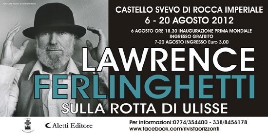 L’evento è promosso dalla casa editrice Aletti di Guidonia (Roma) e dall’Amministrazione comunale di Rocca Imperiale. Prevista per la serata inaugurale del 6 agosto anche le presenza dell’assessore regionale alla Cultura Mario Caligiuri e dell’artista cantautore Omar Pedrini, già leader della rock band più cult d’Italia, i Timoria, e che ha già musicato in passato i testi di Ferlinghetti. La mostra, che durerà sino al 20 agosto proponendo una serie di eventi culturali e artistici, una sorta di laboratorio culturale open, si colloca in quel percorso di marketing territoriale intrapreso dal sindaco di Rocca, Ferdinando Di Leo, in collaborazione con l’editore Giuseppe Aletti e che ha consacrato il borgo ai confini con la Lucania come l’unico “Paese della Poesia” in Italia, creando un indotto economico e culturale nel comprensorio non indifferente.