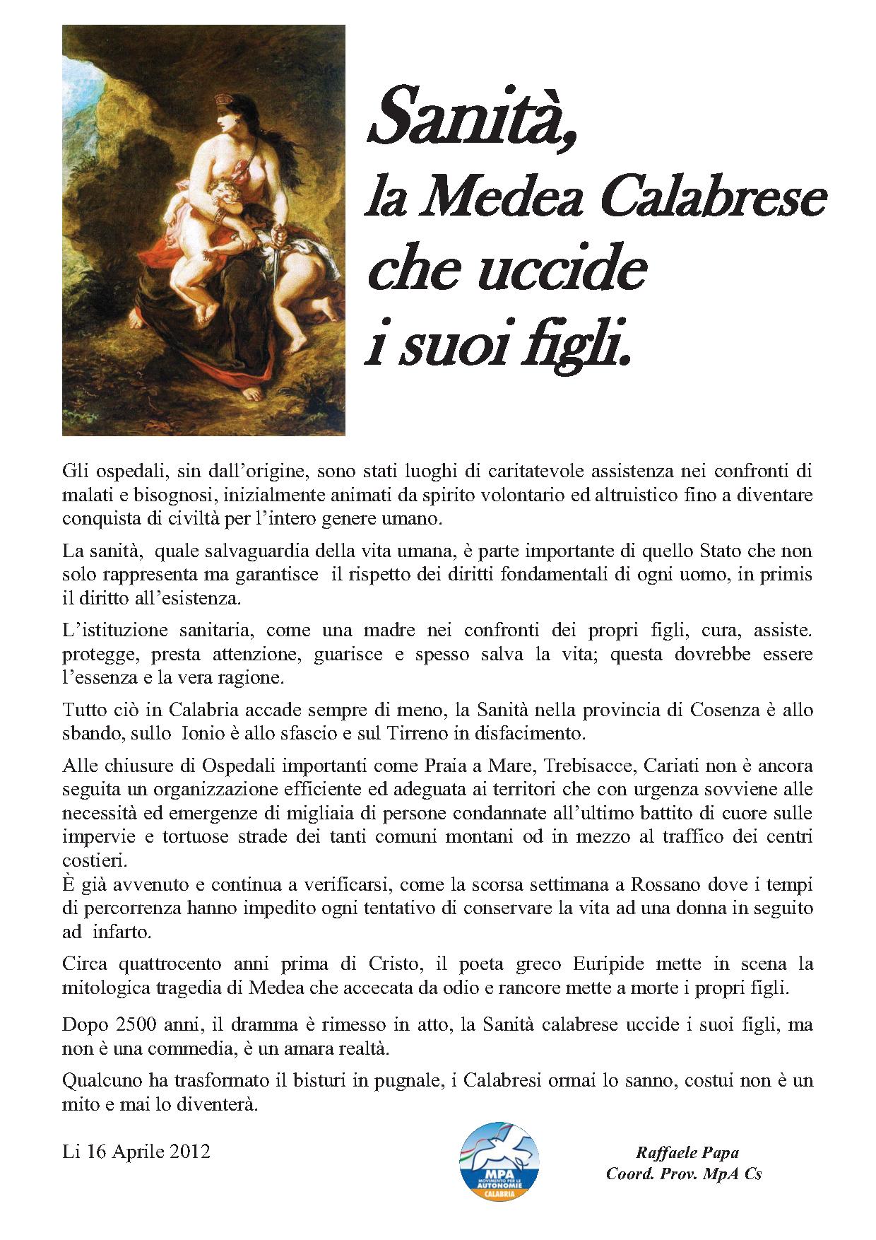 Dopo 2500 anni, il dramma è rimesso in atto, la Sanità calabrese uccide i suoi figli, ma non è una commedia, è un amara realtà.