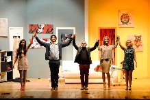 Anche la messa in scena è nuova : trattandosi di una storia in cui le vicende adultere si sviluppano in contemporanea, sul palcoscenico, diviso scenicamente in due, sono state riprodotte l’abitazione di Giorgio e Barbara e quella di Roberto ed Elena. I due ambienti hanno in comune il divano bianco sul quale avvengono le ripetute seduzioni. E la sapiente regia, ispirata all’humor inglese, catapulta lo spettatore da un lato all’altro del palcoscenico, grazie al cambio di luci e di musica.