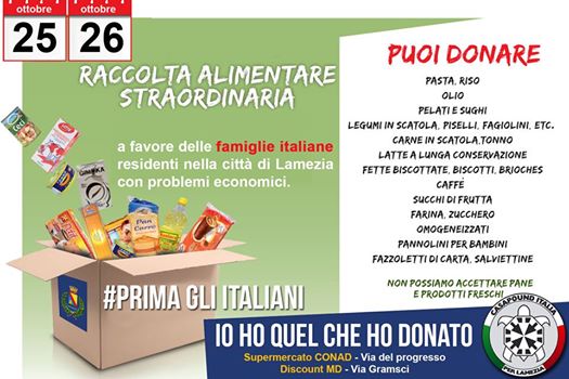 “In un momento delicato vessato da gravi difficoltà economico-occupazionali causato della crisi, i cittadini di Lamezia Terme non hanno esitato a dare un aiuto concreto a quelle famiglie lametine che stanno attraversando situazioni particolari”. Questo è quanto afferma Mimmo Gianturco, responsabile di CasaPound Italia in Calabria.