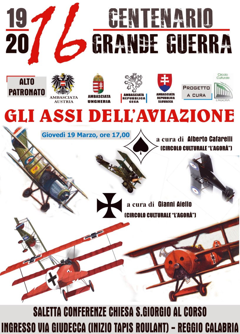 Giovedì 17 marzo 2016, presso la saletta conferenza della Chiesa di San Giorgio (entrata via Giudecca, inizio tapis roulant) di Reggio Calabria, a partire dalle ore 17.00, il Circolo Culturale “L’Agorà” organizza una conversazione sul tema “Gli assi dell’aviazione nella grande guerra“.
