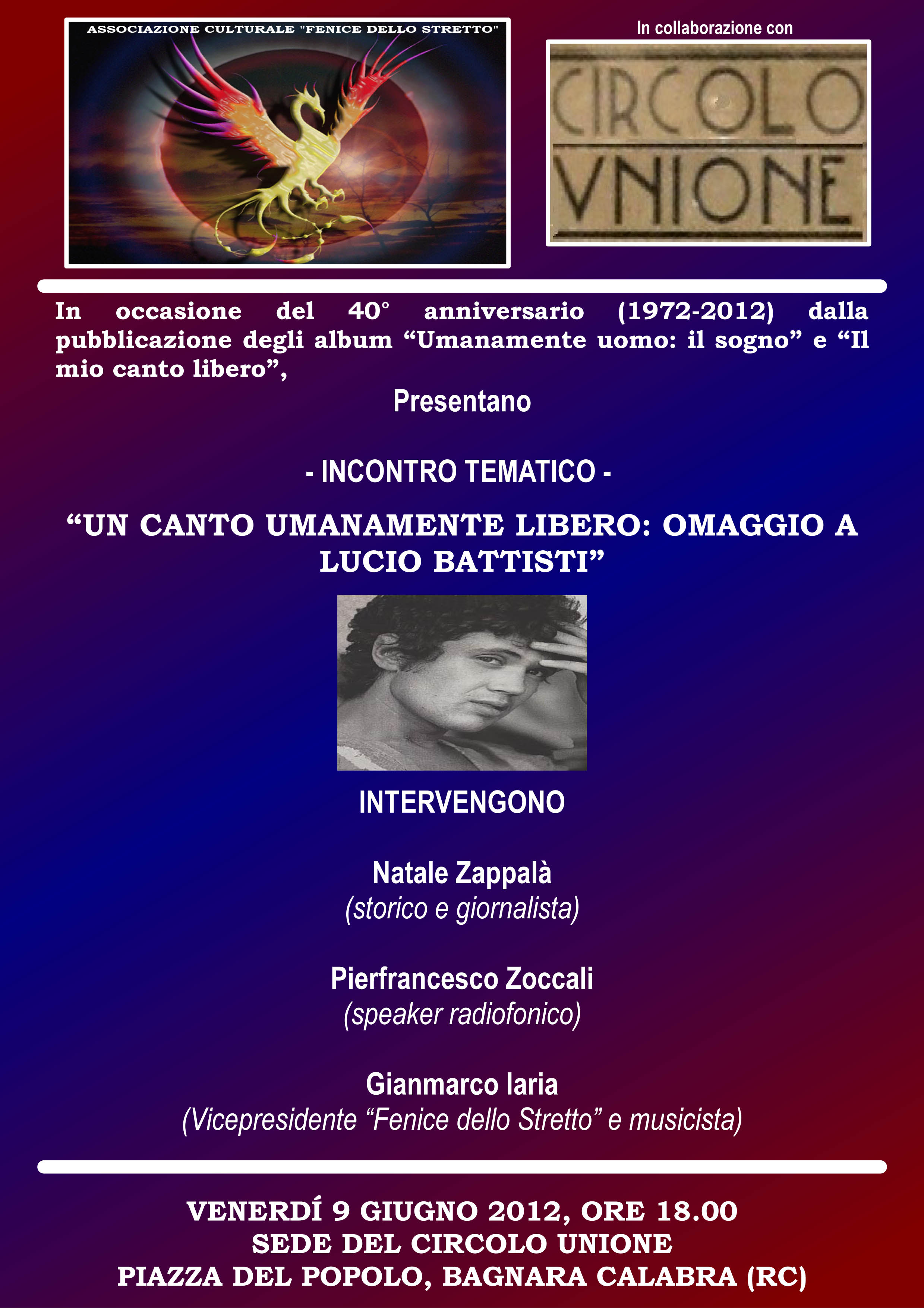 Venerdì 8 giugno 2012 alle ore 18, presso la sede del Circolo Unione di Bagnara Calabra (RC), l’Associazione Culturale “Fenice dello Stretto”, in occasione del quarantesimo anniversario (1972-2012) dalla pubblicazione degli album musicali “Umanamente uomo: il sogno” e “Il mio canto libero”, promuove un incontro tematico intitolato “Un canto umanamente libero: omaggio a Lucio Battisti”, interamente incentrato sull’approfondimento della straordinaria figura del cantautore originario di Poggio Bustone, prematuramente scomparso nel 1998.