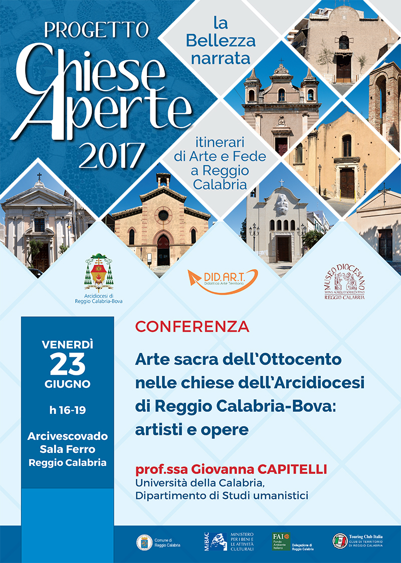 Venerdì 23 giugno alle ore 16.00 in Arcivescovado (via Tommaso Campanella), nell’ambito del Progetto Chiese Aperte, l’Associazione Did.Ar.T. Didattica Arte Territorio e il Museo diocesano promuovono la conferenza “Arte sacra nelle chiese dell’Arcidiocesi di Reggio Calabria-Bova: opere e artisti” a cura di Giovanna Capitelli, professore associato di Storia dell’arte moderna presso l’Università della Calabria.