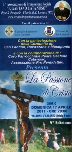 L’Associazione “P. Gaetano Catanoso” con il patrocinio del Consiglio Regionale della Calabria e il Comune di San Lorenzo ha organizzato la V edizione della Passione di Cristo. L’evento è previsto per domenica 17 aprile 2011 alle ore 20:00 e vedrà la partecipazione delle comunità limitrofe di San Fantino, Ravazzana e Musopuniti, del Coro Parrocchiale Padre Gaetano Catanoso e dell’Associazione Pro Pentedattilo.