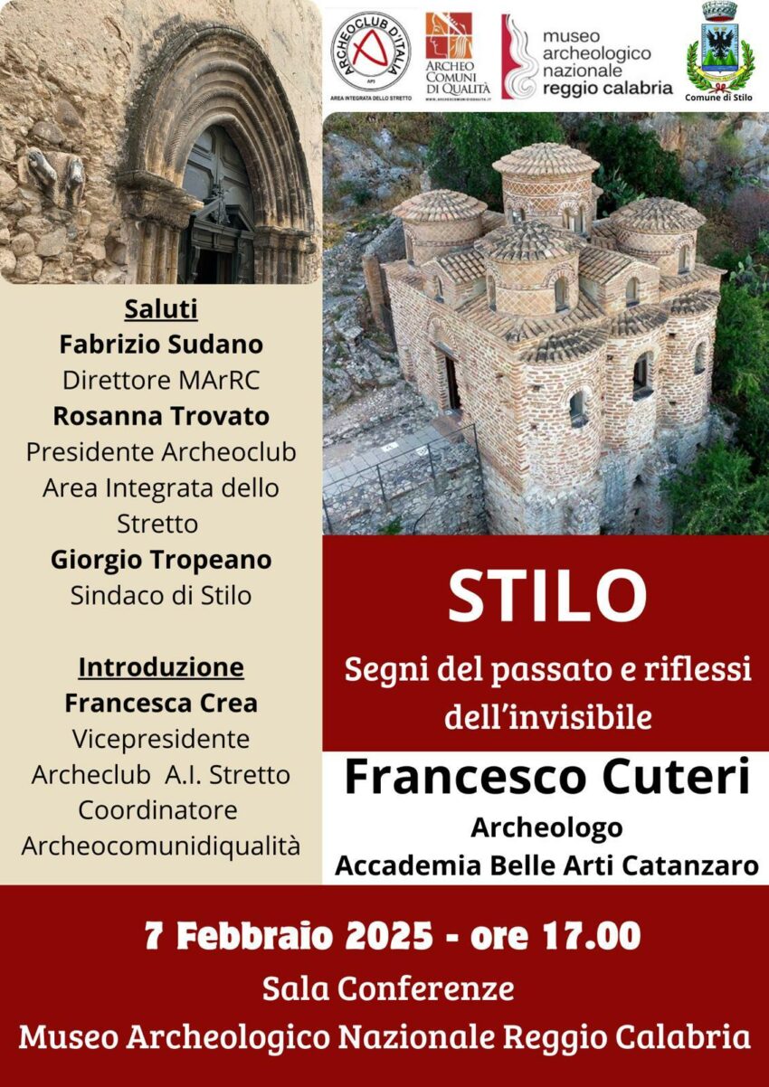 Dopo i saluti del dr. Fabrizio Sudano, Direttore del MArRC, della dott.ssa Rosanna Trovato, Presidente di Archeoclub Area Integrata dello Stretto e del dr. Giorgio Tropeano, Sindaco di Stilo e l’introduzione della dott.ssa Francesca Crea, Vicepresidente di Archeoclub e Coordinatore di ArcheoComunidiqualita’, Francesco Cuteri tratterà il tema “ Stilo.Segni del passato e riflessi dell’invisibile”.