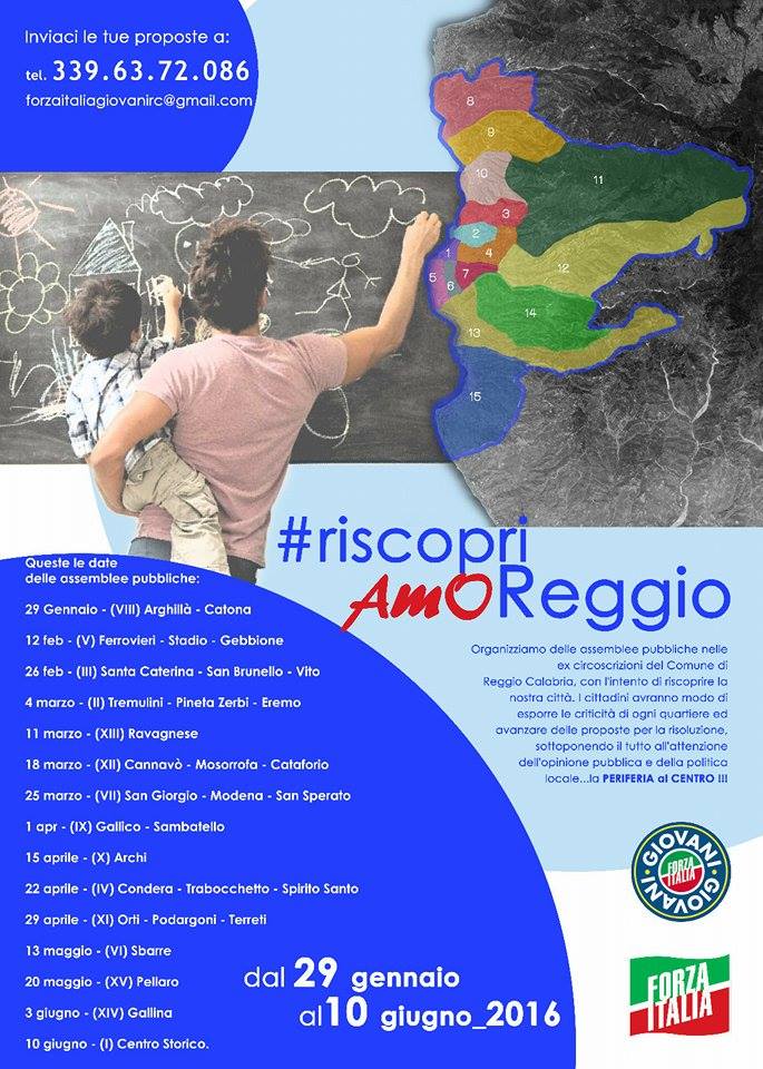 Il Coordinamento Cittadino Forza Italia Giovani Reggio Calabria invita la cittadinanza tutta alla conferenza stampa di presentazione del progetto #riscopriAMOReggio [1], che si svolgerà giorno 11 Dicembre 2015 presso la Sala del Consiglio Comunale di Reggio Calabria “Battaglia” alle ore 18:00.