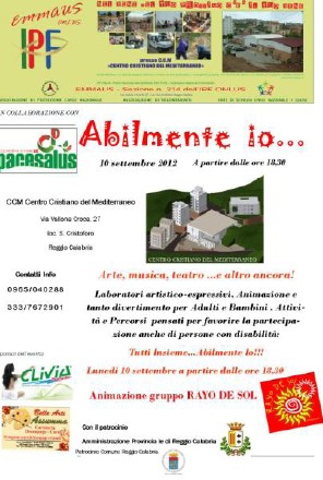 Plauso da parte del Presidente della Commissione consiliare Politiche sociali e componente Tavolo tecnico dei Servizi Sociali – dr.Francesco Plateroti, all’iniziativa “Abilmente io…” organizzata dalla Sezione Zonale n.214 EMMAUS dell’Associazione di Volontariato Istituto per la Famiglia-onlus , con sede presso il CCM – Centro Cristiano del Mediterraneo, in costruzione su un terreno confiscato alla criminalità organizzata. L’evento,con ingresso libero e gratuito, patrocinato dall’Amministrazione Provinciale e dal Comune di Reggio Calabria, ha visto il Centro Cristiano divenire un LABORATORIO ARTISTICO all’aperto, con numerosi punti di ANIMAZIONE E TANTO DIVERTIMENTO PER ADULTI E BAMBINI: MUSICA, CANTO, TEATRO, GIOCHI, CONVIVIO CON LA “CRISPELLATA” e numerose e variegate ATTIVITÀ E PERCORSI PENSATI PER FAVORIRE LA PARTECIPAZIONE ANCHE DI PERSONE CON DISABILITÀ.