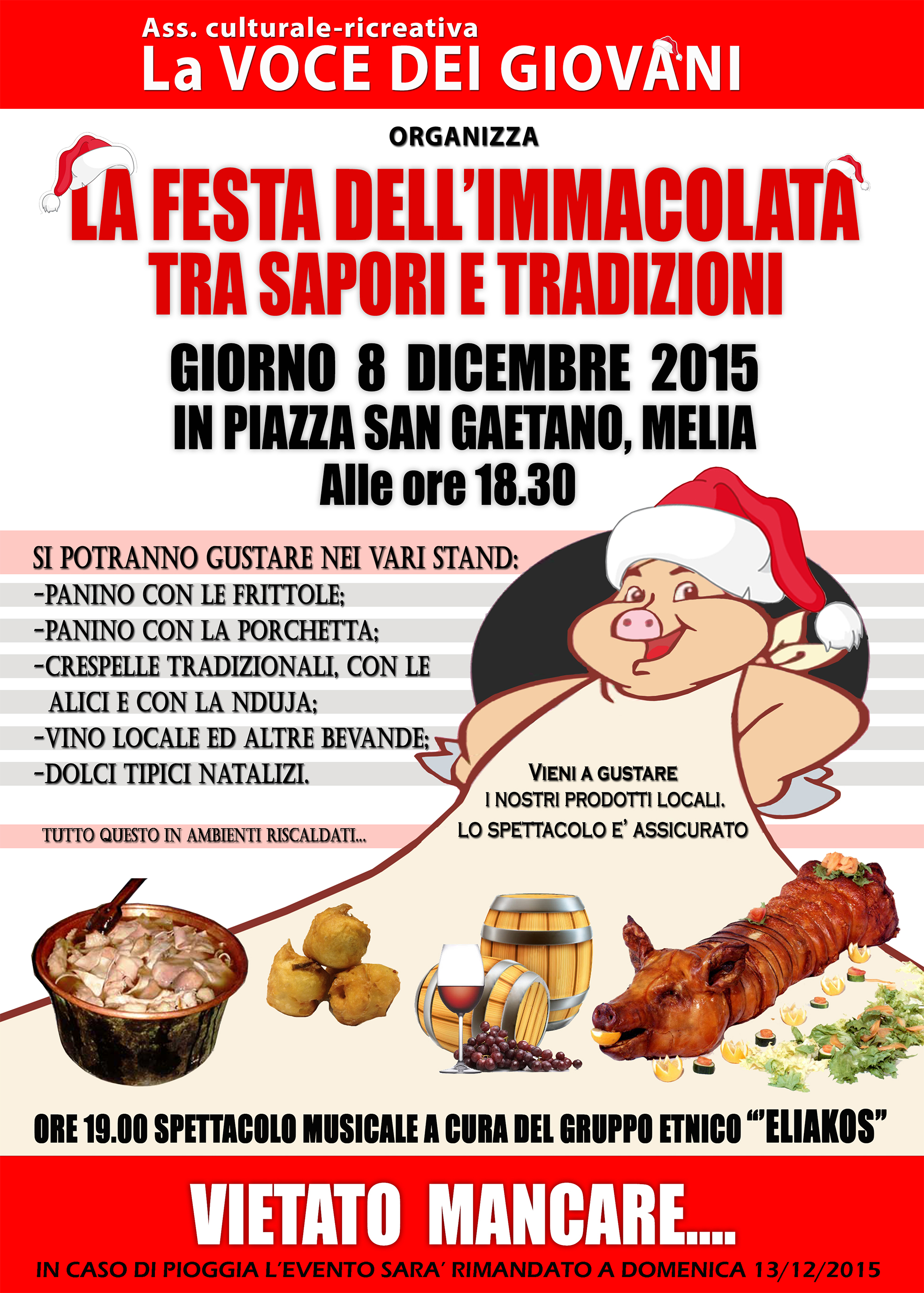 L’8 dicembre 2015 a Melia (RC), avrà luogo un nuovo evento dedicato alla cultura eno-gastronomica, per gustare i migliori piatti tipici del territorio, come le frittole, la porchetta e le crespelle preparati solo con prodotti a KM0 e maiale locale. Tutto con l’accompagnamento della musica etnica degli ELIAKOS.