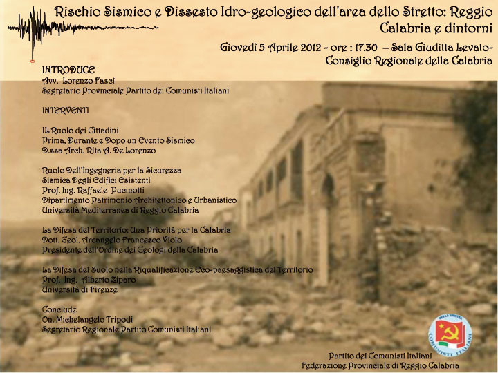 “RISCHIO SISMICO E DISSESTO IDRO-GEOLOGICO DELL’AREA DELLO STRETTO: REGGIO CALABRIA E DINTORNI” che si svolgerà GIOVEDI’ 5 APRILE ALLE ORE 17.30 a REGGIO CALABRIA presso la sala G. Levato del Consiglio Regionale della Calabria.
