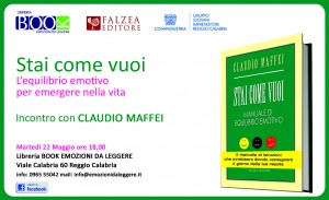 Oggi alle ore 18.00 presso la Libreria BOOK Emozioni da leggere, Viale Calabria, 60 (Galleria Complesso Edilbruzia) R.C. incontro sul libro “Stai come vuoi. Manuale di equilibrio emotivo”.