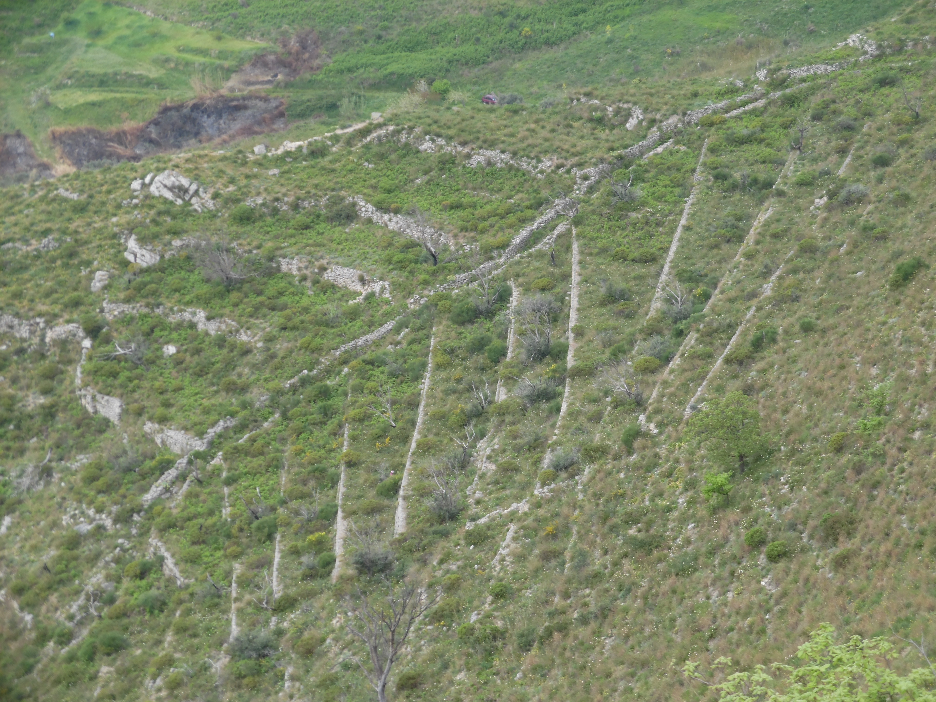 Un’operatrice della soprintendenza che ha ricevuto il materiale ha stimato essere di epoca molto antica, forse età del ferro. Proprio a monte Scifa sono state rinvenute molte tracce di frequentazioni della prima età del ferro, è probabile che questa di Ginarra fosse coeva. Ma forse non lo sapremo con certezza perché nessuno ha voluto accertarlo, ma ai tombaroli questo non importa possono continuare indisturbati. Dicevamo anche di storia e fatica umana, si perché a vedere la valle, sottostante la cima, come è stata terrazzata nei secoli scorsi si resta sorpresi per la perizia e la grazia con cui la semplice sistemazione del terreno da sgretolamento ha prodotto una figura che delinea una lisca di pesce. Al centro una strada selciata della larghezza di circa due metri delimitata da due muri possenti in pietra e da cui si dipartono seguendo l’andamento delle curve di livello altrettanti ponderosi muri a due sezioni molto larghe alla base, per sostenere la spinta del terreno, e un po’ più snelle nell’elevato. Nel complesso vista dall’alto, abbiamo le foto aeree realizzate col drone, è la lisca di una sogliola in formato gigante.