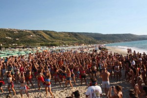 Poi, all’improvviso, la spiaggia sembra svuotarsi di colpo in un’area ben precisa, la folla si ritrae e lascia un enorme cerchio di sabbia vuoto per poi, subito dopo, inondarsi improvvisamente di una vera e propria marea umana. È il più grande flash mob su spiaggia che si realizza in Calabria dopo giorni e settimane di lavoro svolto al computer, tra amicizie, link, pagine facebook, YouTube, messaggi e condivisioni virtuali sui socialnetwork.