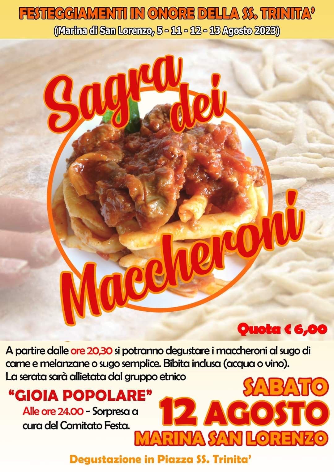 Nel calendario, organizzato dal Comitato festa SS. Trinità 2023 ritorna, sabato 12 agosto, la famosa “Sagra dei Maccheroni” che da oltre un decennio caratterizza le estati di Marina di San Lorenzo e attrae visitatori dal capoluogo e da tutti i comuni limitrofi.