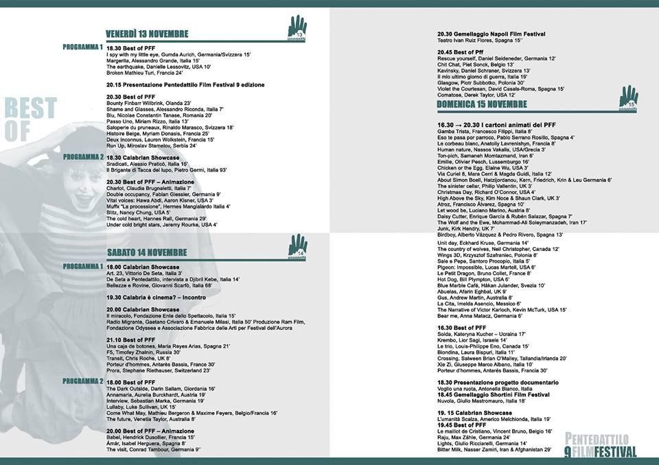 Attesa per la nona edizione del “ Pentedattilo Film Festival”, che si terrà nel borgo antico, a partire dal 13 al 15 novembre alle ore 21:30. Il tema trattato sarà: “Best of” e saranno mostrati per tre giorni i cortometraggi di filmaker, provenienti da tutto il mondo (USA, Olanda, Francia, Israele, Serbia, Romania, Svizzera, Germania, Grecia, Belgio, Lussemburgo Cartoni animati del PFF, Canada, Ucraina, Polonia, Messico,Iran & Afghanistan). Irrinunciabile sarà pure, la sezione dei cartoni animati.