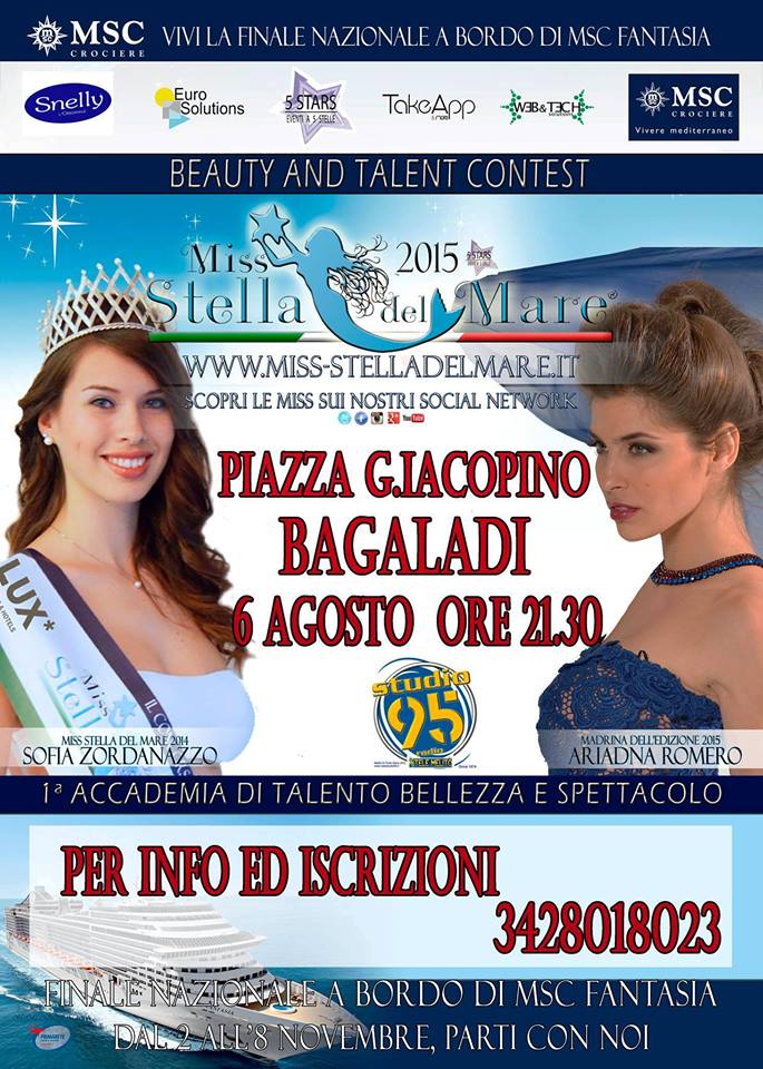 L’associazione teatrale – culturale “I Giovani del Gagini” nell’ambito della IX edizione di Arte e Teatro in Piazza organizza nella suggestiva cornice di Piazza Iacopino a Bagaladi le selezioni del Concorso di bellezza “MISS STELLA DEL MARE 2015″.