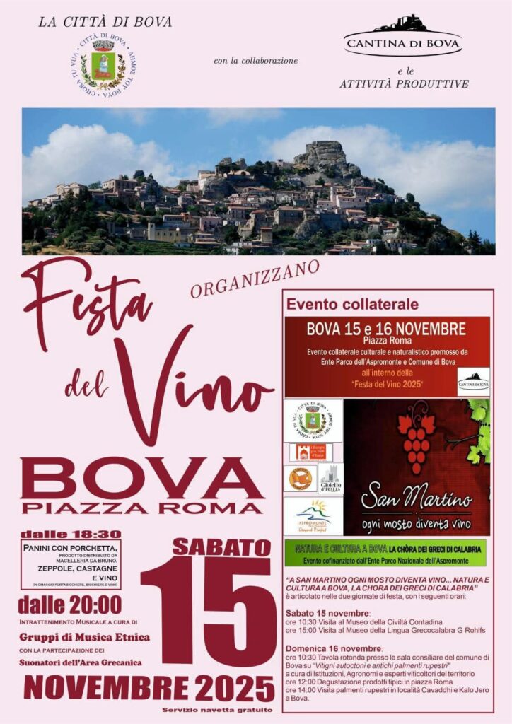 L’appuntamento principale si terrà sabato 15 novembre 2025 in Piazza Roma, a partire dalle ore 18:30, con degustazioni di vino di Bova, panini con porchetta, zeppole e castagne. Dalle ore 20, l’intrattenimento musicale sarà affidato a gruppi di musica etnica con la partecipazione dei suonatori dell’area grecanica.
