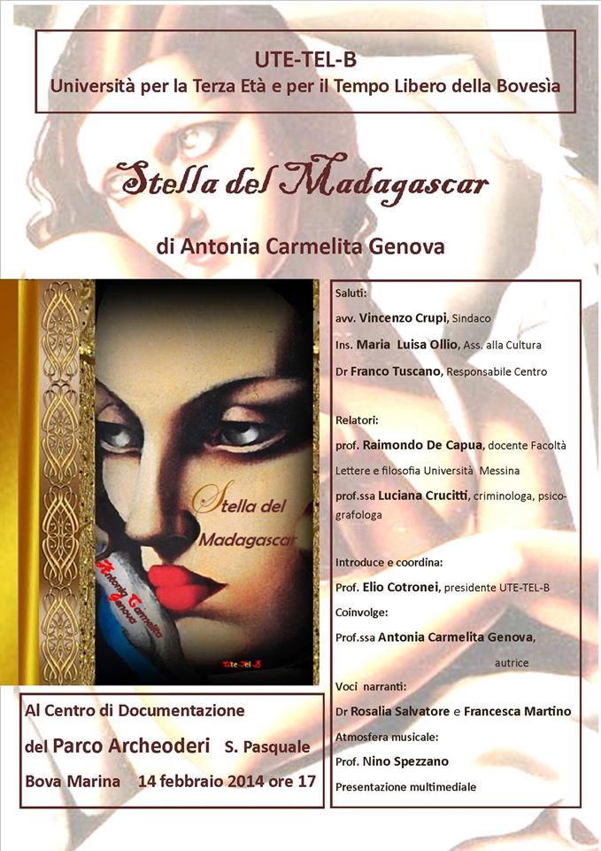 Il libro Stella del Madagascar edito dall’ Università per la Terza Età e per il Tempo Libero della Bovesìa è un invito dell’ autrice a condividere una storia che si trasforma in una visione fatta di seduzione, di bellezza e d’ amore. E ‘ un racconto romantico che solleva e unisce in prosa poetica le radici della bellezza. Una ballata con uno stile raffinato che porta il lettore a sognare e a volare. Le parole trasportano percependo il fascino, un racconto nudo che ti fa vivere l’ istinto. Sfogliando le pagine del testo si avverte la necessità della scrittrice di sfuggire l’approvazione degli altri, ribelle e anticonformista cerca di astrarre anima e corpo. Scrive: “ Aria notò che alcune piante invasate in coppia si stendevano carnosi petali, abbondanti steli e corolle. Simbiosi perfetta di colori e profumi. L’ evoluzione dell’esistenza nella socialità sembra contraddire i convincimenti di Darwin fondati sulla legge del più forte, lo struggle for life”. La bellezza dell’ amore. “Sono nuda.. a cuore nudo.. e mi offro a te”. A corredo della sua storia predilige artiste che sente vicine, Tamara de Lempicka e Irina Vitalievna Karkabi in cui è chiara l’ assonanza di uno spirito indomito unanime, che raccontano l’ inquietudine di una vita in costante primo piano, estrose che hanno saputo rappresentare il lato freddo e al tempo stesso sensuale dell’ arte.