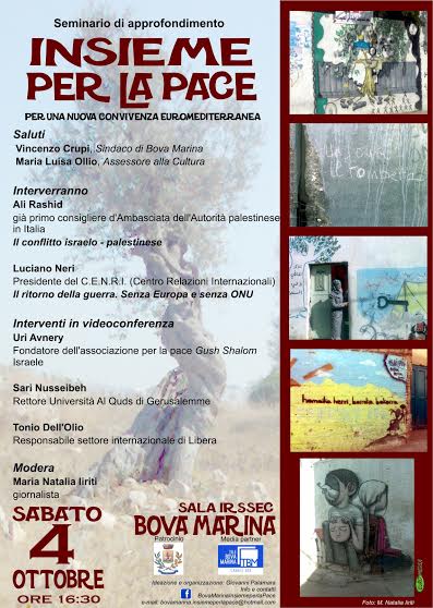 Si terra Sabato 4 ottobre a Bova Marina alle ore 16.30, il seminario“Insieme per la pace per una nuova convivenza euromediterranea”. Al seminario prenderanno parte Ali Rashid, Luciano Neri e, in videoconferenza Tonio Dell’Olio, Uri Avnery e Sari Nusseibeh.