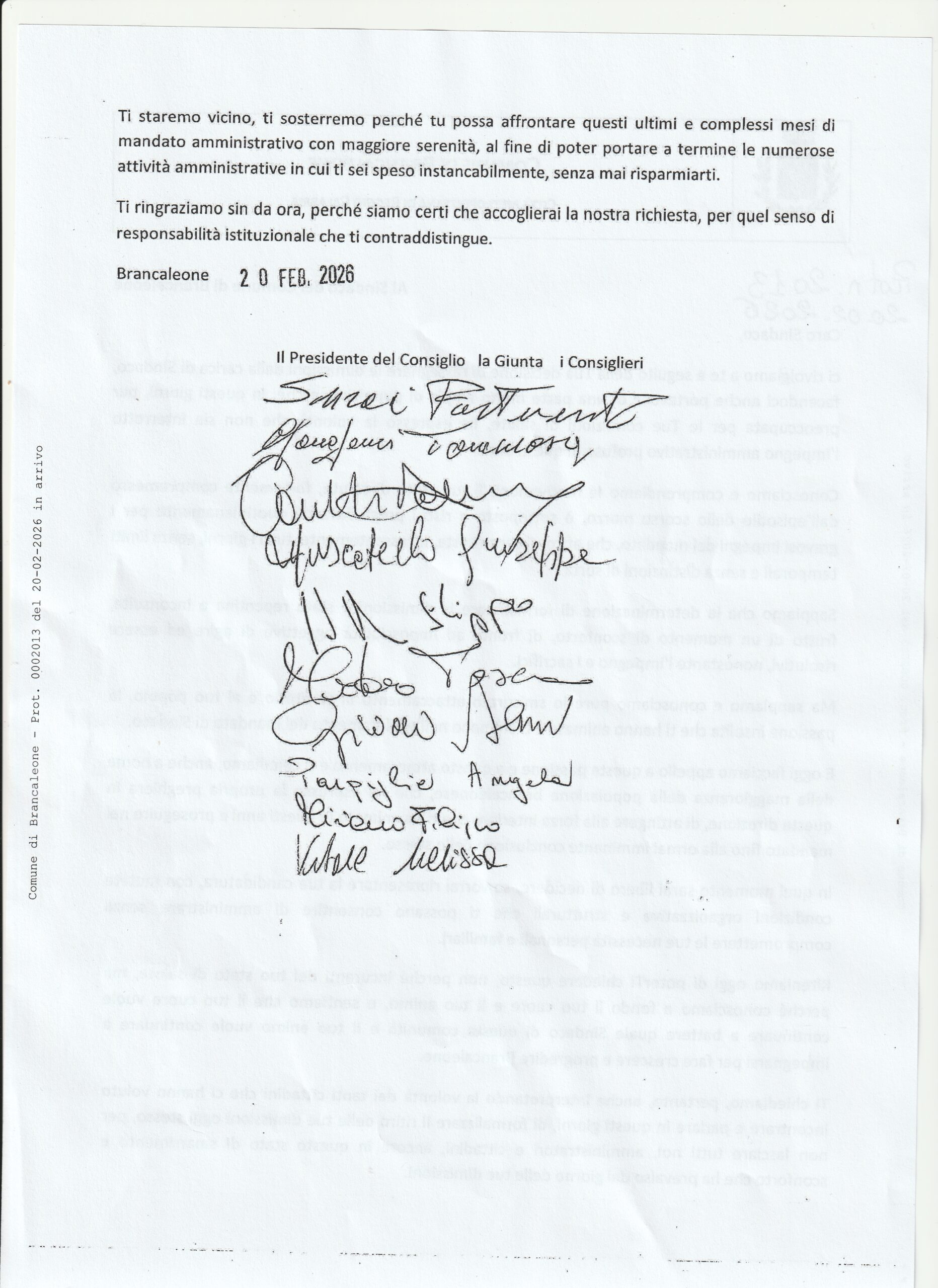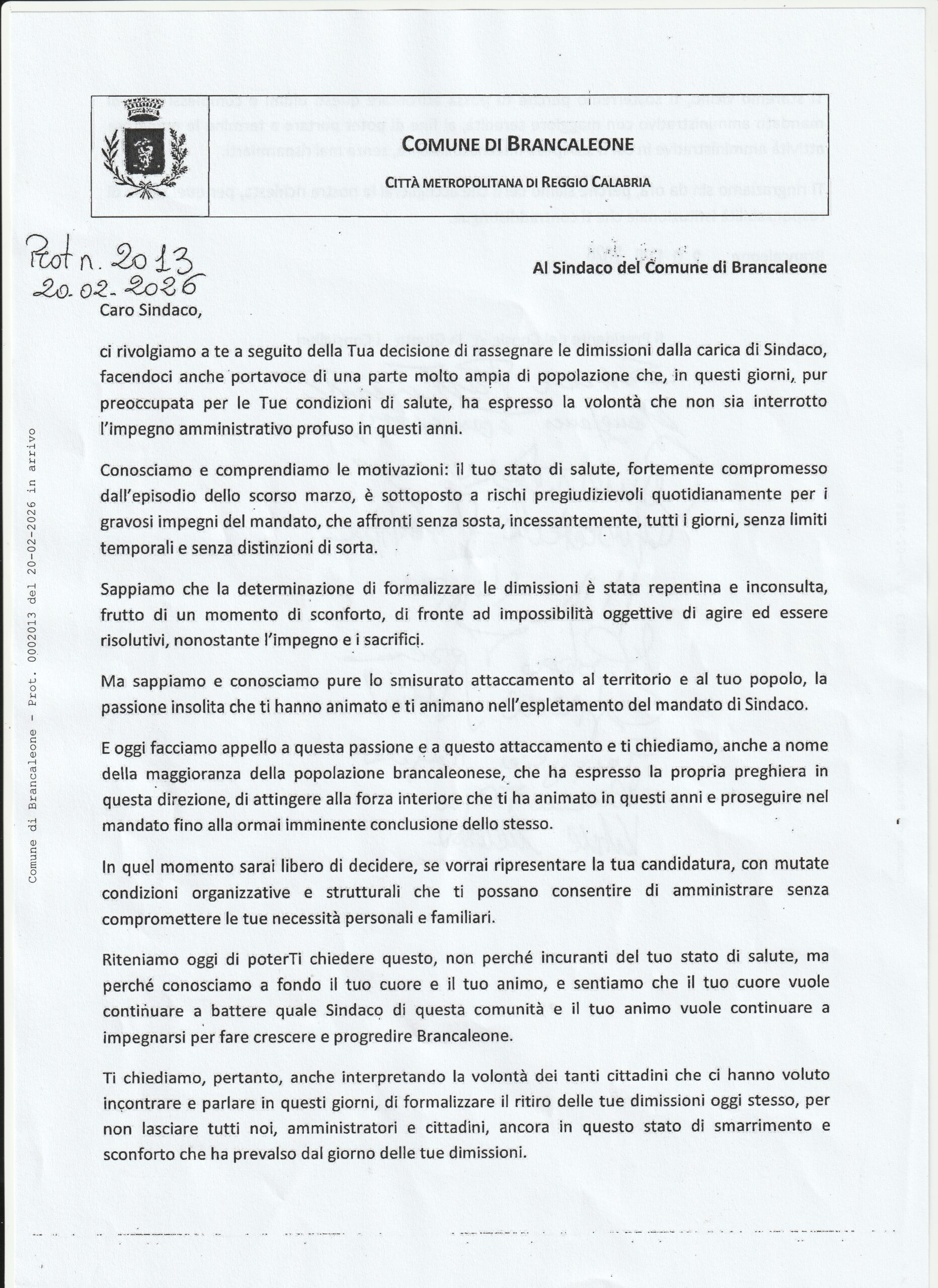 Nella lettera emerge lo smisurato attaccamento del Sindaco al territorio e alla passione che lo ha animato nell’espletamento del suo mandato, chiedendogli di proseguire fino alla naturale conclusione. Al termine del mandato – continua la lettera – il Sindaco sarà libero di valutare una nuova candidatura, con condizioni organizzative e di supporto tali da non compromettere le sue necessità personali e familiari.