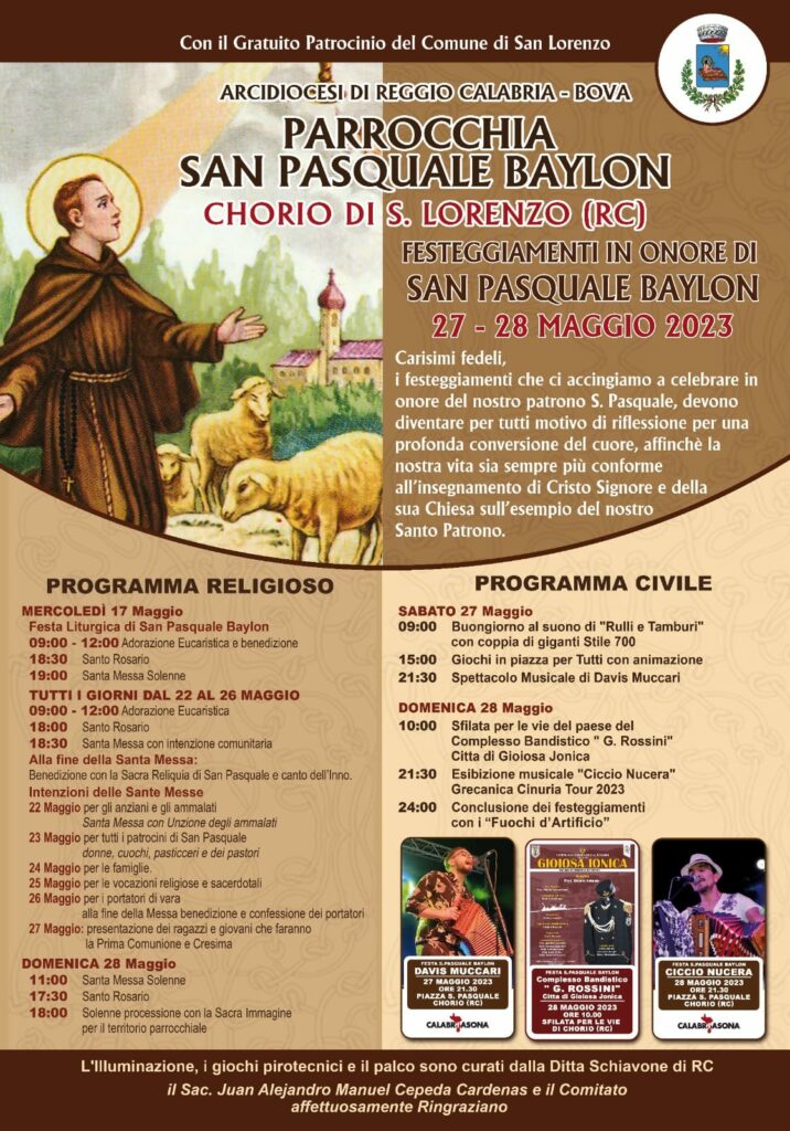 Festeggiamenti in onore di San Pasquale Baylon nei giorni del 27 e 28 Maggio 2023 a Chorio di San Lorenzo, in provincia di Reggio Calabria. La Parrocchia San Pasquale Baylon ha organizzato anche quest’anno due giorni di festeggiamenti in onore del Santo.
