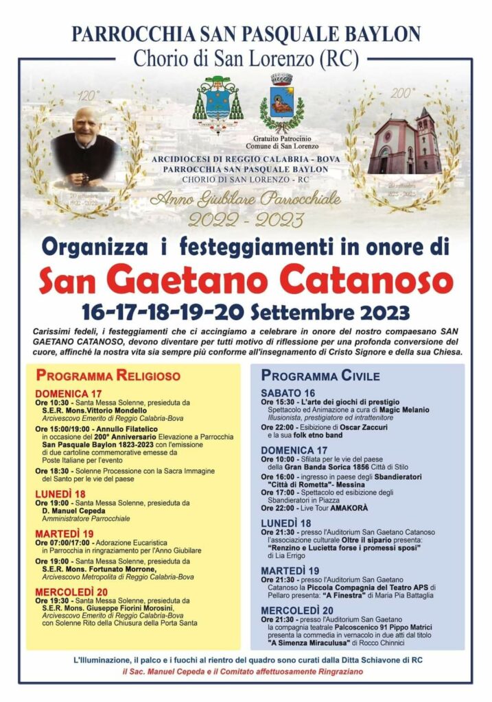 Quattro giorni intensi quelli previsti in onore di San Gaetano Catanoso a Chorio di San Lorenzo. Dal 16 al 20 Settembre 2023 la frazione laurentina del comune di San Lorenzo ospiterá vari appuntamenti sia religiosi che civili. Sará anche l’occasione per festeggiare l’Anno Giubilare Parrocchiale 2022-2023.