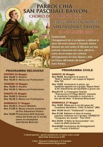 Mancano ormai pochi giorni ai consueti festeggiamenti che si svolgeranno a Chorio di San Lorenzo in onore di San Pasquale Baylon. Appuntamento al 26 e 27 maggio 2018 per i festeggiamenti civili.