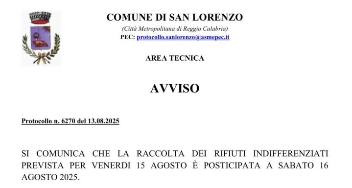 Si informa che il servizio di raccolta dei rifiuti indifferenziati, inizialmente programmato per venerdì 15 agosto, sarà effettuato sabato 16 agosto 2025.