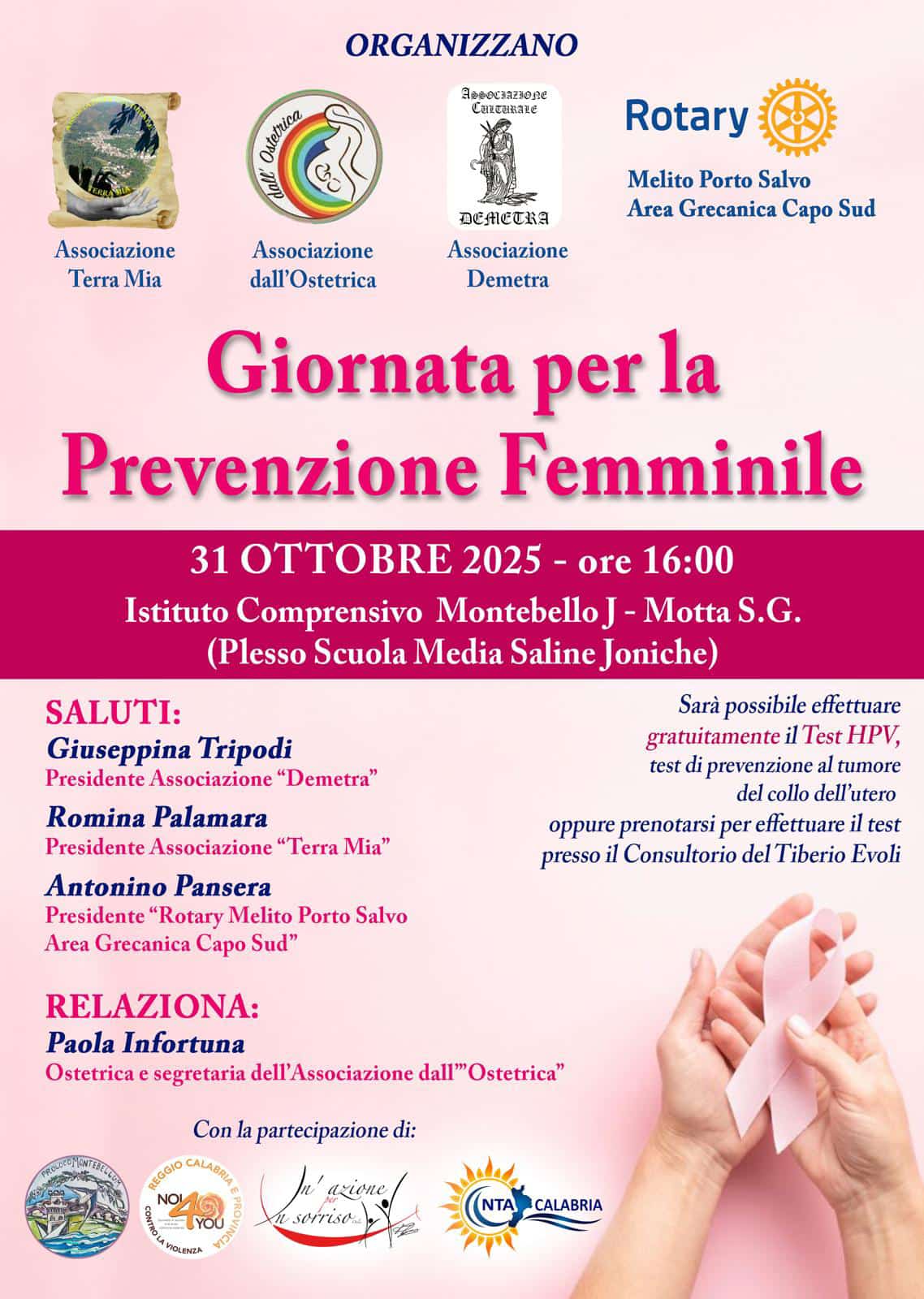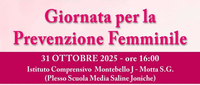 Il 31 ottobre 2025, ore 16:00, l’Istituto Comprensivo Montebello Motta, presso la sede della scuola media di Saline Ioniche, ospiterà il secondo appuntamento della Giornata di Prevenzione Femminile.