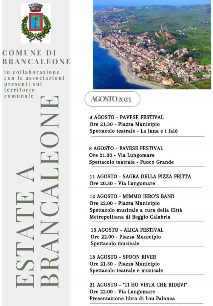 Tutto pronto per l’estate 2023 a Brancaleone Marina. Il comune ha pubblicato la locandina con i vari eventi che si terranno dal 4 al 21 Agosto. Sette serate all’insegna dell’intrattenimento.
