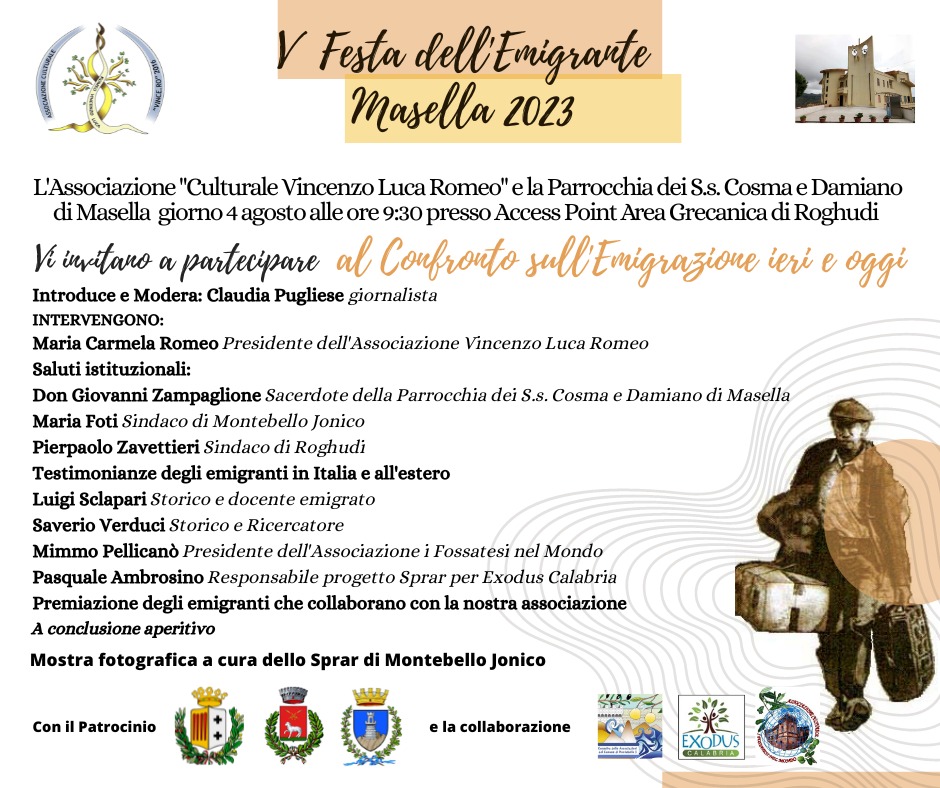 L’evento è patrocinato dalla città metropolitana di Reggio Calabria e a titolo gratuito dal comune di Montebello Ionico e dal comune di Roghudi. La manifestazione verrà inaugurata venerdì 4 alle 9:30 del mattino, all’Accesso Point Area Grecanica di Roghudi, con un “Dialogo sul tema dell’emigrazione ieri e oggi”. In questa occasione verranno premiati gli emigranti associati più attivi e generosi all’estero e in Italia. I ragazzi dello Sprar di Montebello Jonico esporranno la loro mostra fotografica. Nel pomeriggio seguirà l’animazione in piazza per i più piccoli con i gonfiabili, ma anche i giochi antichi a cura dell’associazione “I Fossatesi nel Mondo”. La serata continuerà con degustazioni e film in piazza.