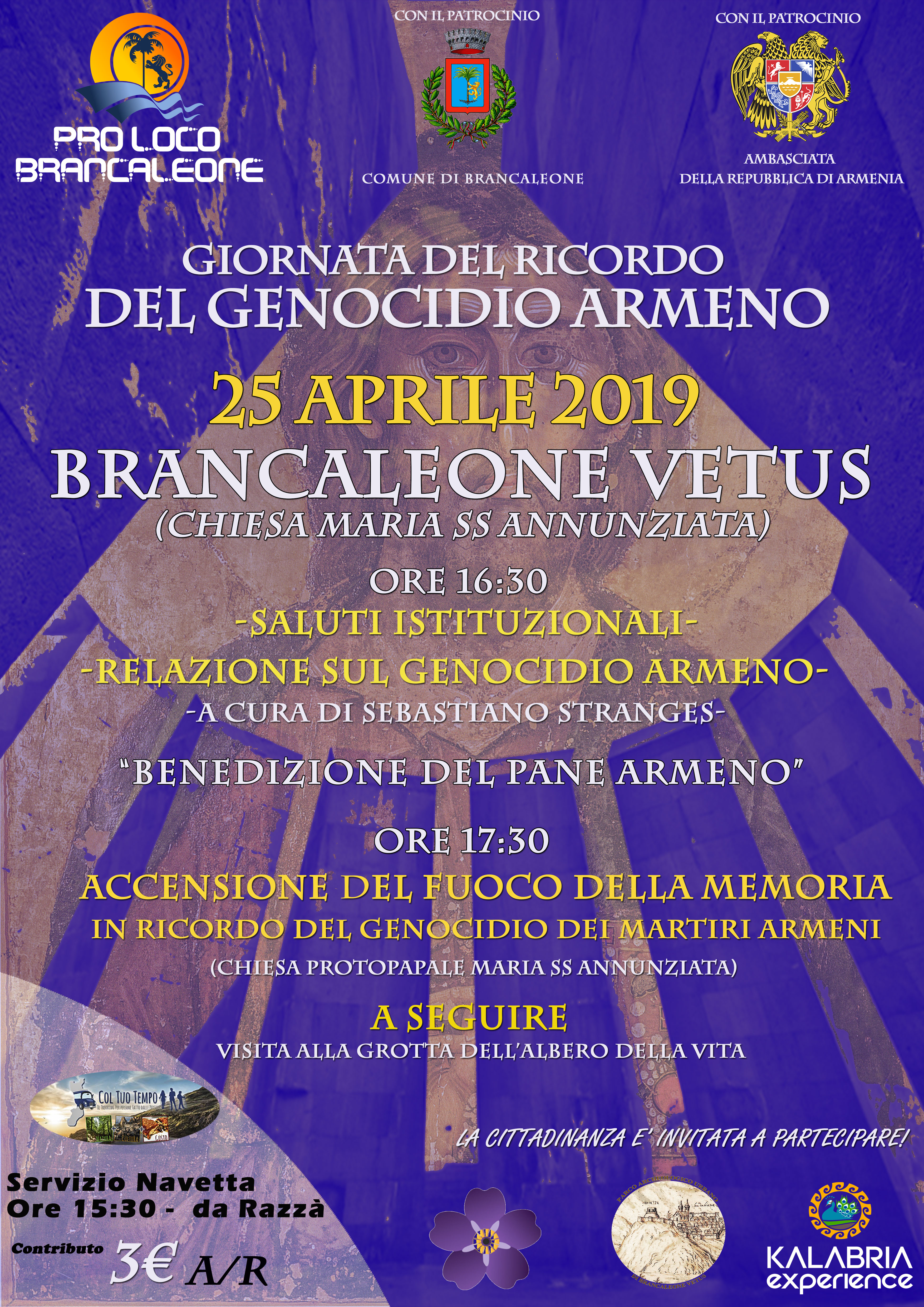 Anche quest’anno – fa sapere Carmine Verduci, presidente della Pro Loco di Brancaleone – la nostra associazione, con il Patrocinio Morale dell’Ambasciata della Repubblica di Armenia; e dell’Amministrazione Comunale di Brancaleone ha organizzato l’importante giornata del ricordo per il popolo Armeno. L’evento si terrà presso una delle sedi più antiche e caratterizzate dalla presenza di popoli che hanno lasciato a noi e in tutto il territorio segni tangibili del loro passaggio. Si celebrerà a Brancaleone Vetus alla presenza di autorevoli personalità; accompagnati da delegazione Armena per condividere un momento di riflessione molto intimo.