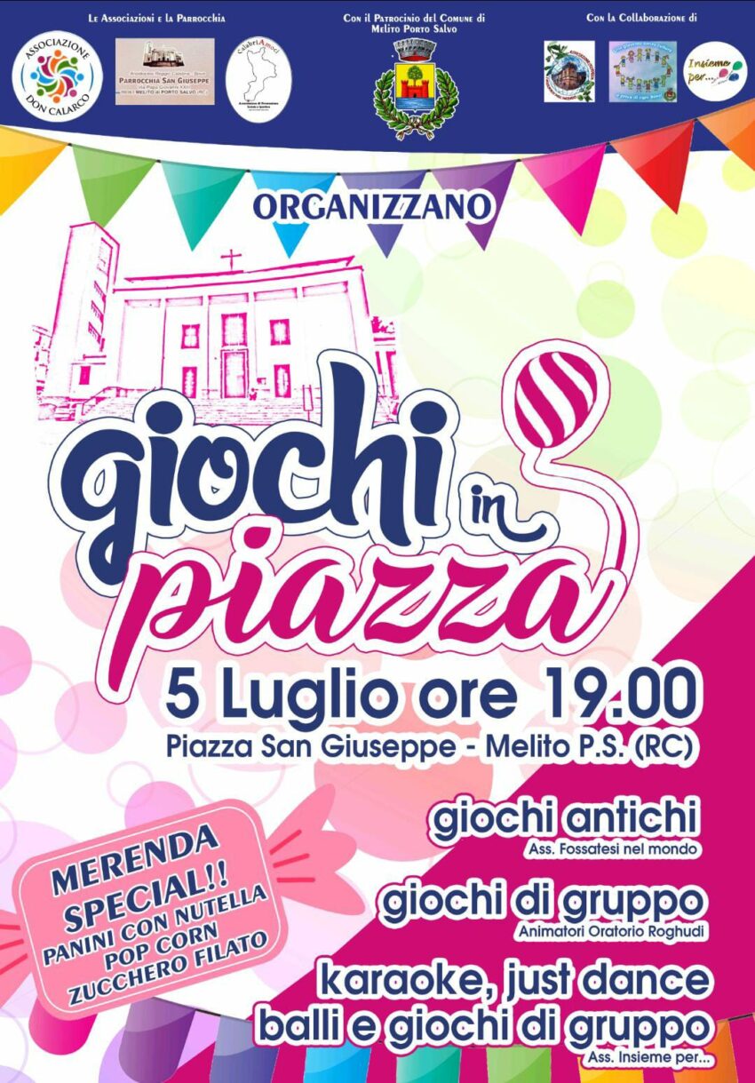 L’estate melitese si accende con un evento dedicato alla socialità, al gioco e al sorriso dei più piccoli. Sabato 5 luglio 2025, a partire dalle ore 19:00, Piazza San Giuseppe si trasformerà in un colorato spazio ludico per accogliere la manifestazione “Giochi in Piazza”.