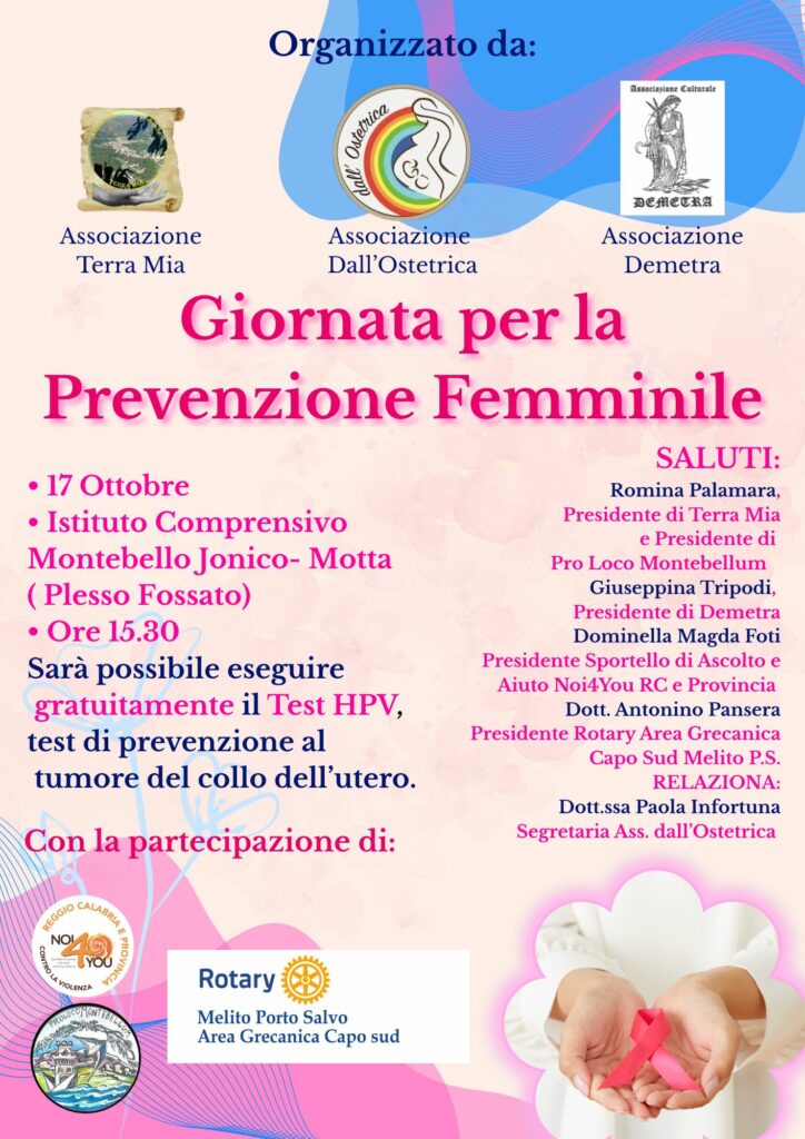 Il territorio grecanico si mobilita per la salute femminile. Le associazioni Terra Mia, Demetra e Dall’Ostetrica organizzano una Giornata di Prevenzione Femminile, che si terrà giovedì 17 ottobre presso il plesso di Fossato dell’Istituto Comprensivo Montebello Jonico – Motta, con inizio alle ore 15:30.