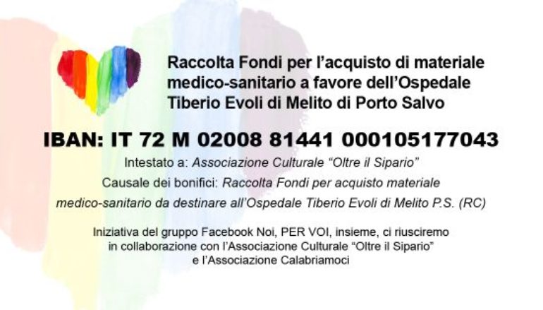 - Causale dei bonifici: Raccolta Fondi per acquisto materiale medico-sanitario da destinare all’Ospedale Tiberio Evoli di Melito P.S. (RC).