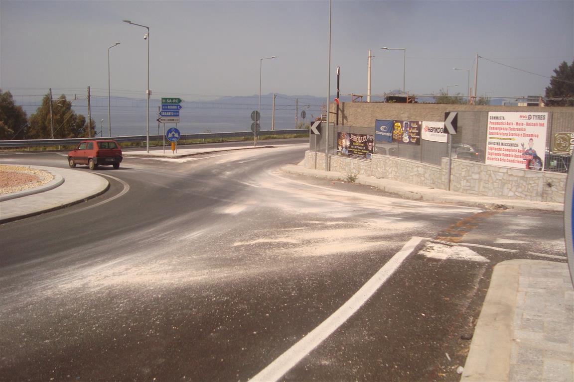 Si deve segnalare che la rotatoria per circa 300 mq. (trecento) ricadrebbe su terreno di proprietà dei titolari della succitata attività commerciale, in quanto non risulterebbe eseguito l’esproprio. Su detta area privata ricadrebbe un impianto di illuminazione pubblica. Resta da segnalare, per il momento, la necessità di chiudere l’adiacente varco che permette l’accesso al torrente Ferrina in quanto i veicoli che percorrendo l’alveo fluviale (pur essendo vietato dalla legge) giungono sulla Ss 106 e invece di svoltare verso Reggio si immettono in senso vietato nella rotatoria direzione Melito determinando gravissimo pericolo per la circolazione veicolare e pedonale. Forse non siamo riusciti a rendere chiaro l’alto indice di pericolosità che la rotatoria mantiene e le criticità che la stessa presenta, ma i competenti tecnici recandosi sul posto possono benissimo prendere contezza della condizione di reale e grave pericolo esistente e che si è cercato di descrivere.