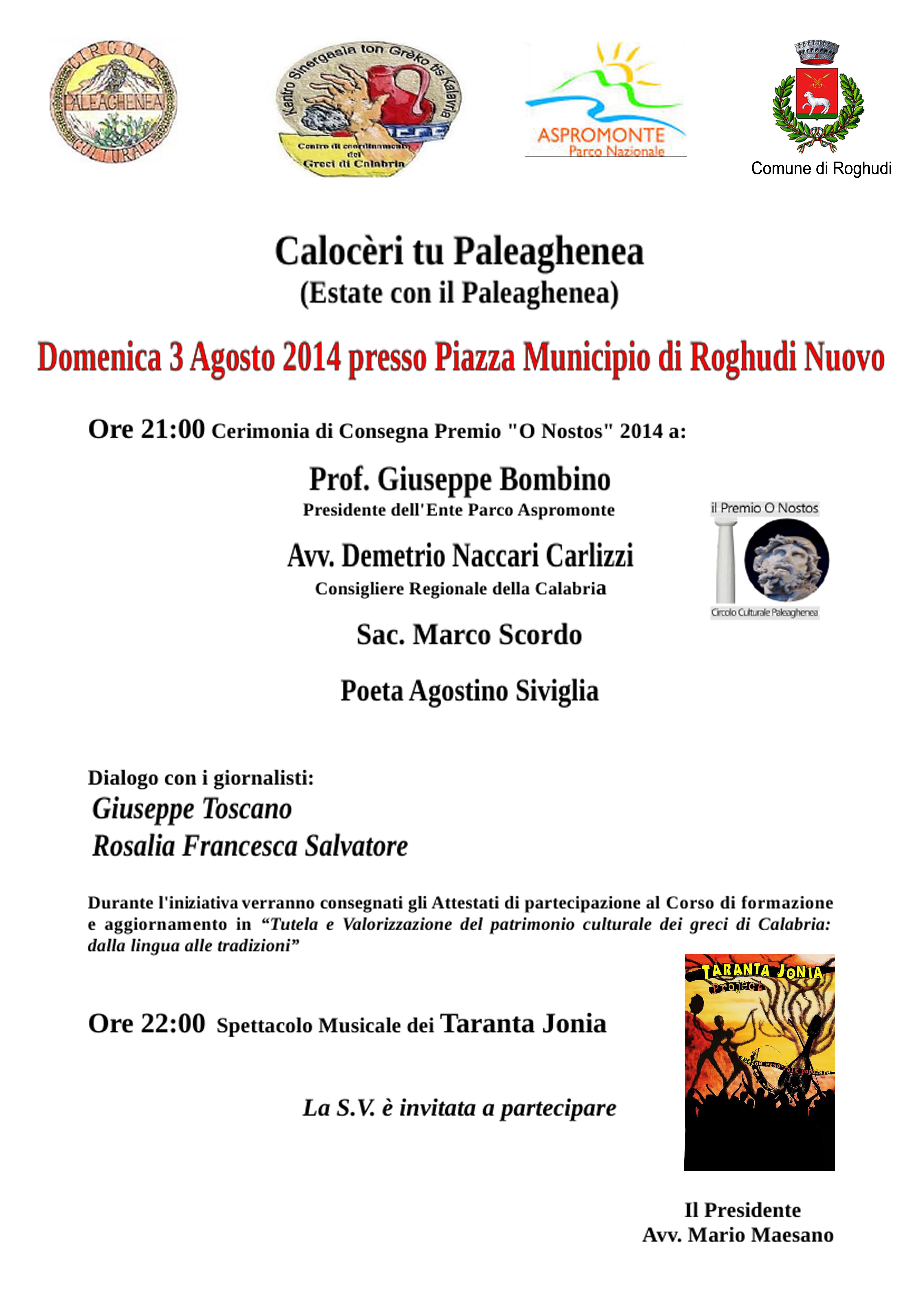 Il Presidente Maesano, a seguito del grave e incolmabile lutto che ha colpito il Paleaghenea per la dolorosa scomparsa del Vice Presidente Rag. Lorenzo Siviglia, sentite tutte le parti attivamente coinvolte nell’organizzazione della manifestazione Calocèri Tu Paleaghenea, nel condividere il sentire comune di tutti gli animi,